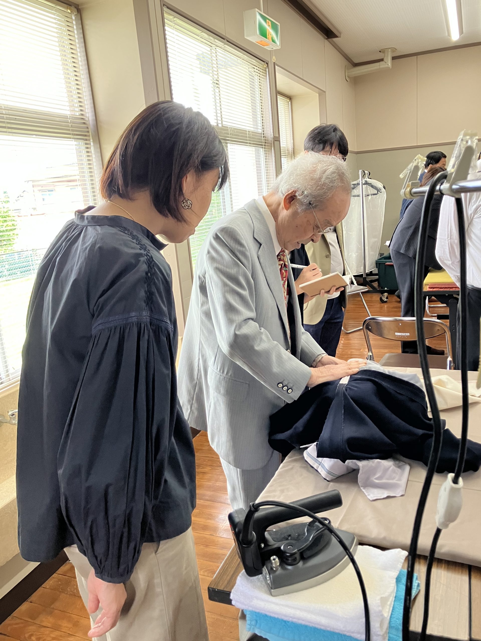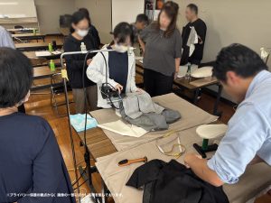 今回は、松田先生が開発された専用洗剤を使用したウェットクリーニングの手法、洗い後のハンギング方法、スラックスをテーマにしたテーラードプレスの実習、さらにジャケットのボタン付けまで、盛りだくさんの内容で行われました。