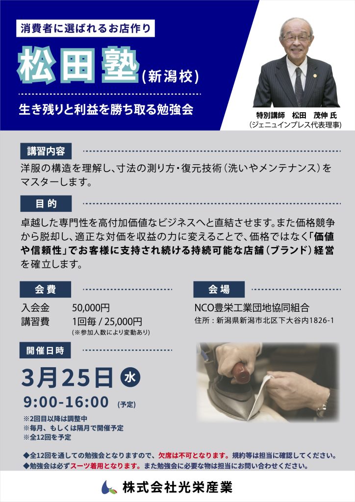 講習会では概要説明となっておりましたが、この度正式に本格的に技術を学ぶ『松田塾 新潟校』として開校いたします。
